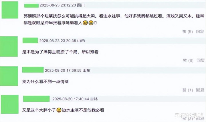 《边水往事》中郭麒麟的演技被吴镇宇、王迅、蒋奇明等一众演技派比下去,已经说明了他的演技还演不了主角,更撑不住大银幕的检验。